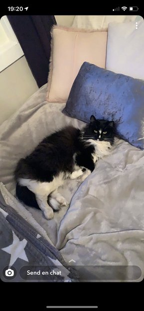 Ho er svart og hvit og langhåra. Tidligere i våres blei ho barbert på begge sidene, ryggen og magen.