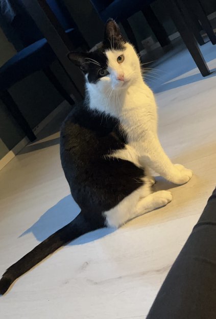 Svart og hvit, kort pels. Har gule øyne og er skipskatt.