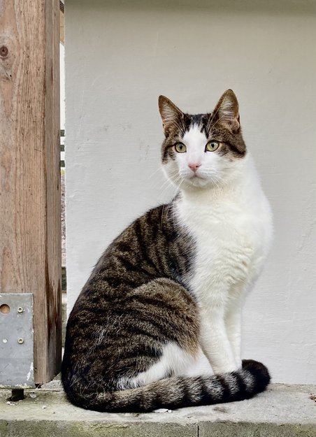 Tigris er engstelig for fremmede, men kan være kontaktsøkende mot andre katter. Er litt tynn og har lang hale og lange ben.