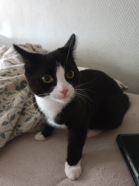 Hvit og svart skadet katt ca 6 mnd funnet ute hos meg, tatt med til veterinæren på Romsås senter. Tatt røntgen og påvist lårhalsbrudd. Veldig tillitsfull. Ikke chippet.