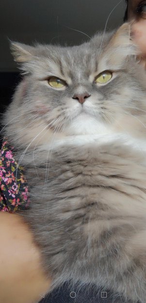 Han har hvite poter. krøllete pels bak ørene, stort sett lys grå, men nakken og magen er hvit og har litt lyse brunn/gull rund kinnene. Han har Chip.