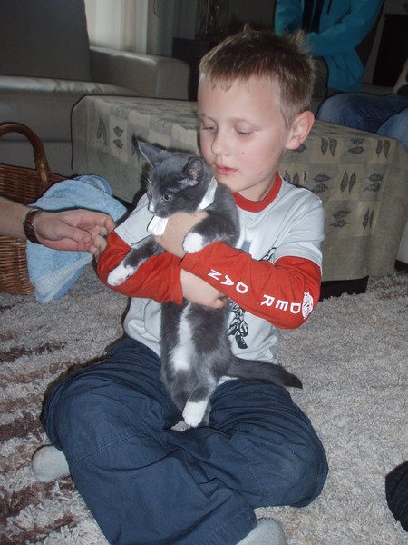 Grå med hvite poter, snute og buk.