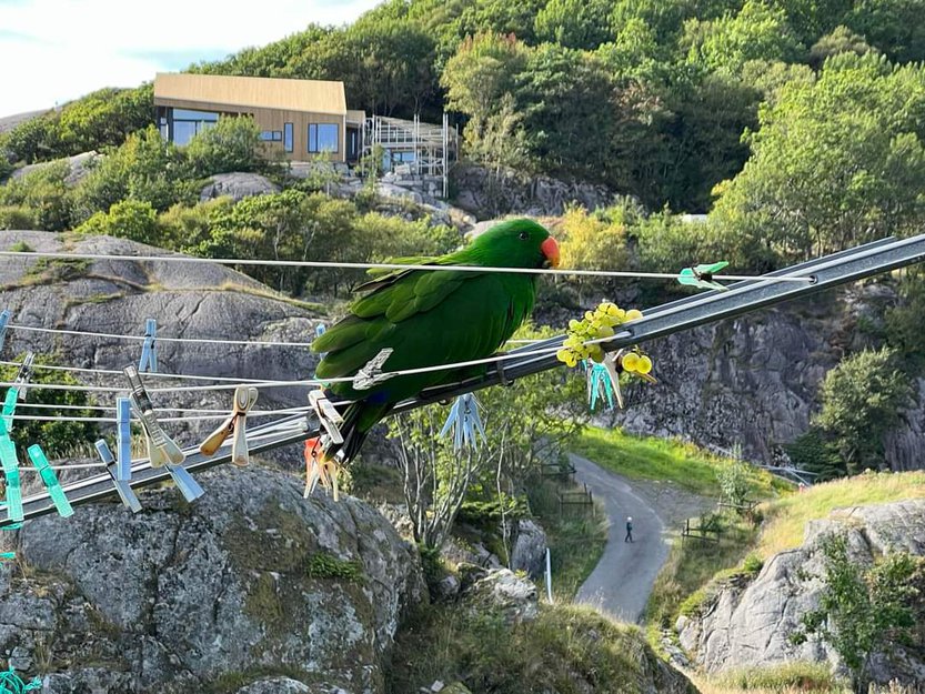 En grønn papegøye landet i hagestuen til foreldrene mine på Nesvåg, Sokndal. Rett med Nesvåghålo.