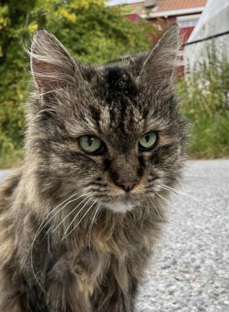 Veldig sammenfiltret pels, ingen halsbånd. Kontaktsøkende og uredd.