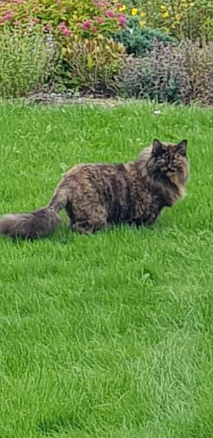 Har nylig vært hos dyrlege og fått løveklipp, så den har pels på hale, føtter og hode, ellers er den ganske snau. Har kun en hjørnetann igjen. Hengemage grunnet sterilisering. Stort sett innekatt, og nokså sky.