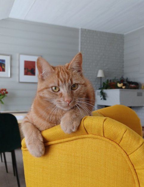 Liten, slank, oransje/hvit stripete katt. Hvit på haletuppen. Litt skvetten, men sosial og kosete når trygg.