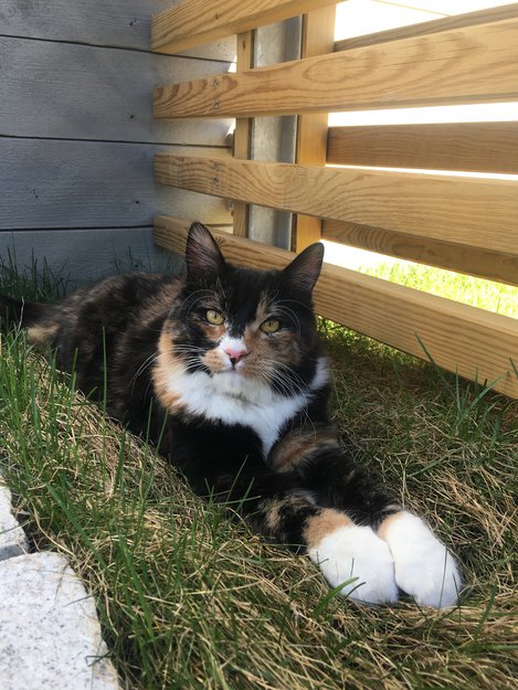 En vennlig sjel fant henne mjauende ved Bærum sykehus og tok henne med til dyrlegen, som fant oss gjennom chipen hennes. Hvem vet hvordan hun rotet seg så langt bort. Vi er så glade for at hun er trygg og tilbake hos oss.