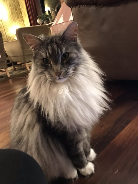Han har litt lang pels, men kortere enn på bildet da han får sommerklipp hver vår, men pelsen er likevel lang. Han har hvitt bryst og poter. Ellers er pelsen lys grå spraglete.