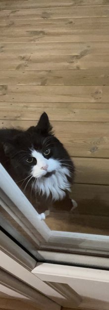 Tjukken som han blir kalt til vanlig er svart og hvit, og er langhåret. Hvit mellom øynene som går nedover til nesen, som videre går ut på hver siden over munnen, og ned til brystet.