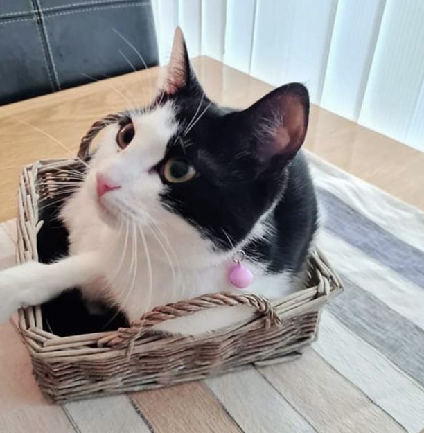 Sky, liten av vekst, svart og hvit mønstret i kort pels. Hun er id chippet.