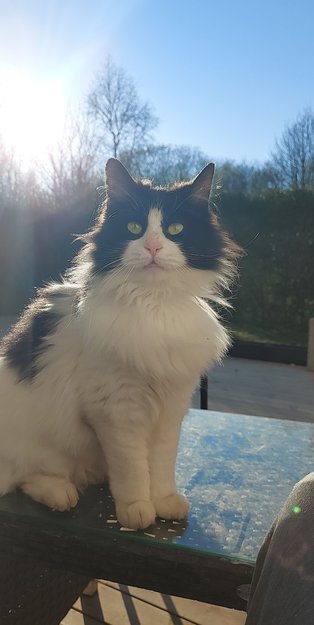 Sort og hvit, har lite pels på venstre framfot siden hun ble behandlet for et bittsår sist hun stakk av.