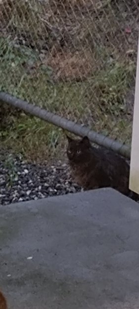 Svart langhåret katt som står å mjauer ved inngangen vår,men den er redd og vil ikke komme når jeg roper. Den bare står å mjauer mot meg og løper om jeg kommer mot den. Har en hukatt som den følger etter og er aggressiv mot henne. Den er ikke her hver dag.. men ikke sett den her før nå i september, kan være den har funnet ut at her hos er det kanskje mat siden vi har vannskål stående ute til vår katt.