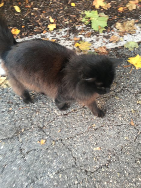 Halvlang pels, mørk/sort. Løper bort til folk, tillitsfull og mjauer mye. Liker å få kos. Noen klumper i pelsen. Virker litt rastløs.