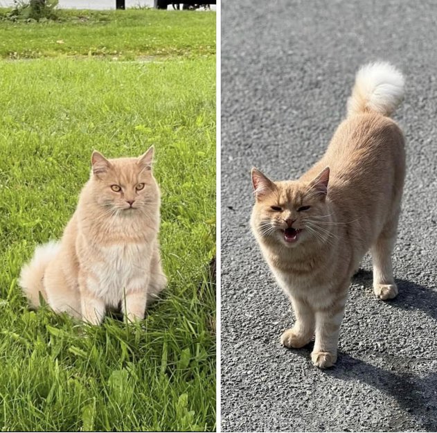 Ett år gammel hannkatt, kastrert og chippet. Har vanligvis halsbånd med GPS men dette har falt av. Halvlang oransj/beige pels med lys mage. Ca 5 kg.