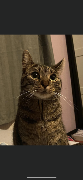 Liten kattepus med spisse ører. Er tigerstripet med fargene grå, lysebrun, og brun over hele kroppen.