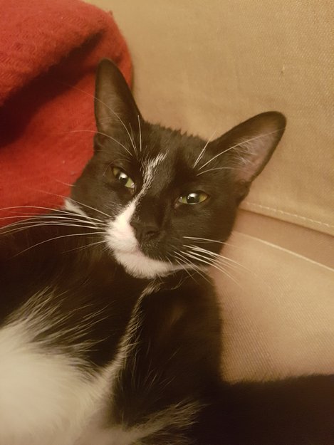 Svart med hvite poter, hvit på mage, bryst og hake. Hun har også en hvit stripe langs snuten. Hun har på seg reflekshalsbånd og har en pipete mjauelyd. Litt sjenert.
