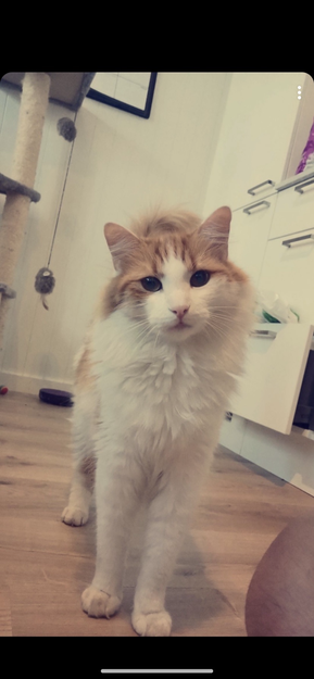 Han er en lang håret oransje og hvit katt som er veldig glad i folk, kos og oppmerksomhet