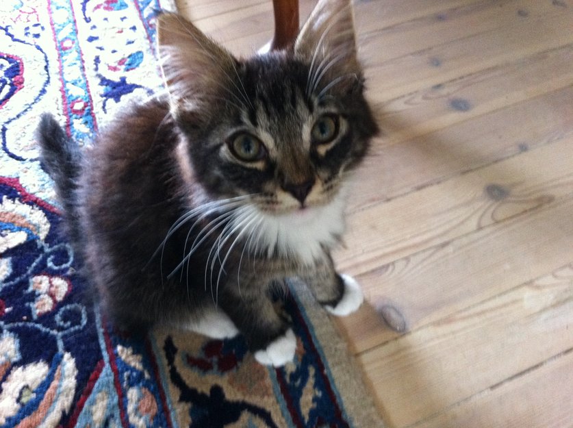 Kattunge. Sto og mauet kl 01,30 i natt og var veldig sulten. Hadde prøvd å komme in hele kvelden. Er ca. 3 mnd. tror jeg. Veier ca 1.5kg.