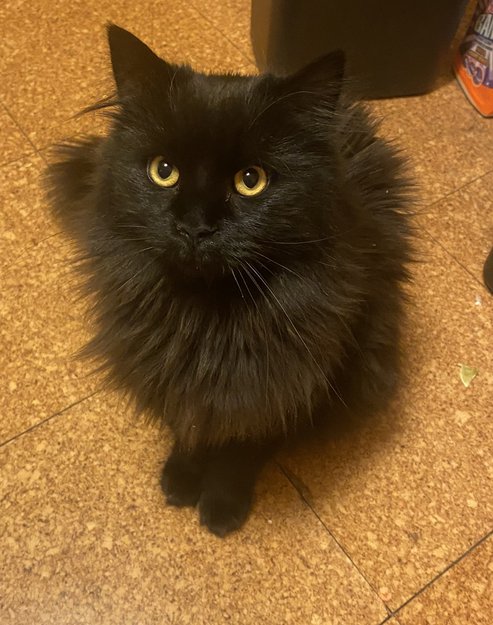 Han er svart og semi langhåret, med noen grå striper i pelsen og får lett floker. Blanding av norsk huskatt/skogkatt og har gule øyne. Han kan være veldig pratsom og gi fra seg små klukkelyder når han trives. Han er kjælen, tillitsfull og svært nysgjerrig, og han kommer gjerne bort om man holder frem en lukket hånd til ham.