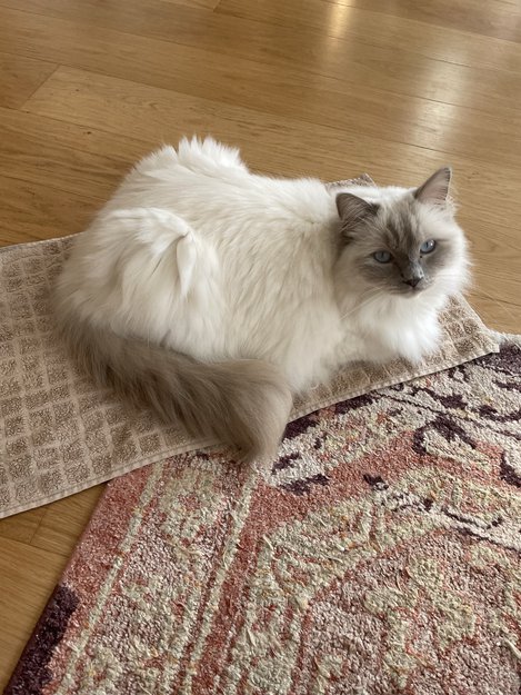 Teddy har lyseblå øyne, lys brunfarge i ansikt, ører og på hale. Han er ca 5 kg.