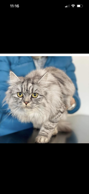 Har en del farge/mønster fra maine coon(far), men størrelsen fra chinchilla perser(mor).