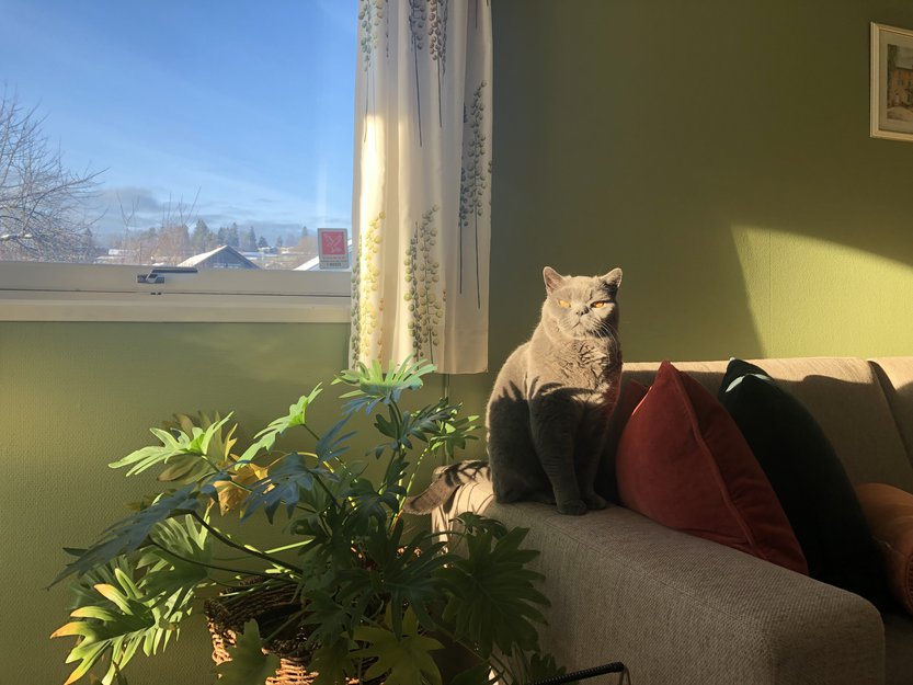 Ikke veldig sosial og hilser ikke på fremmede. Gule øyne, grå og tykk pels.