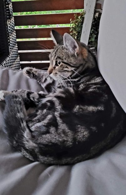 Han er en liten katt, med spraglete mønster i grå/brunfarge. Han hadde et rødt halsbånd når han forsvant.
