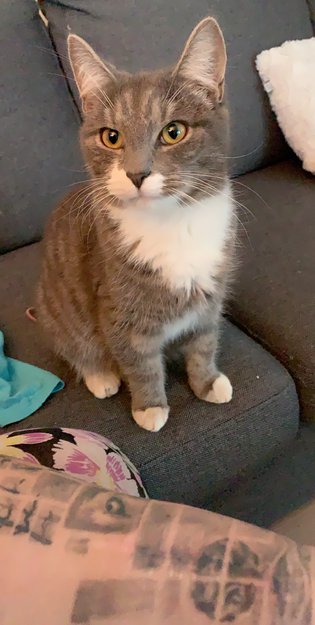 Maxi er en grå og hvit katt på 3 år, han er kastrert. Men ikke chippet! Ikke veldig kjelen, men heller ikke redd mennesker. Han er grå på rygg,hale, ansikt og ytterside på fremben. Hvit under neseparti og underside av kropp, bakben. Han er en ganske stor hannkatt på ca 6 kg. (Ingen kjente allergier, om noen har matet han!)