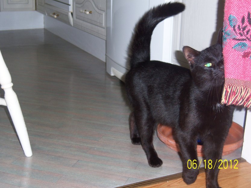Pus dukket opp i nabolaget ved Moradammen i begynnelsen/midten av juni. Han virker ganske ung - kanskje 1/2 år gammel? Han var sky og håndredd, og "gråt" sårt... Noen naboer satte opp plakater - og i begynnelsen av juli satte jeg opp nye ved div. matforretninger og ved postkontoret. Pus har holdt seg i nærheten, og nå vet jeg at han liker å bli klappet (litt) - han må da ha en god familie et sted? Min pus er ikke så begeistret - ikke naboens heller - så jeg håper de han egentlig bor hos tar kontakt snart!
