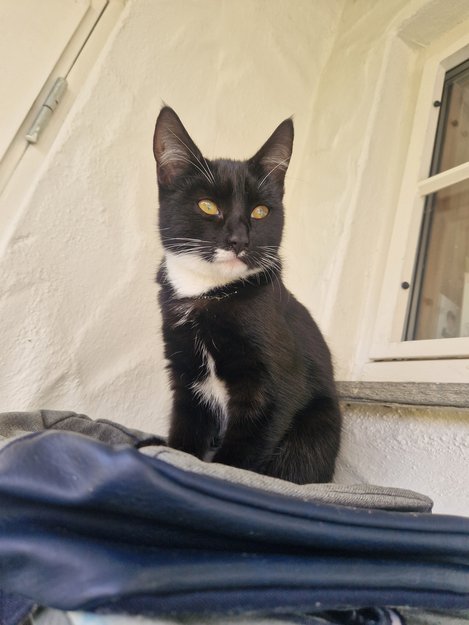Katten har sølv halskjede og har gått rundt og stått på døren vår i mer enn en uke. Vi er bekymret for at hun har mistet eieren sin eller har vært uten mat siden den gang.