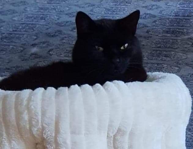 Helsort hunnkatt på 9 år, litt brunskjær i sola. Hun er kastrert og chippet.