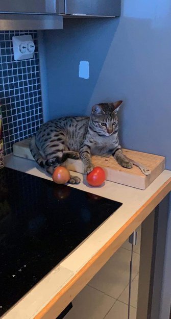 1 årig jente med brun/grå pels med svarte prikker og svart stripe over hele ryggen og ut over halen, mjauer ofte veldig høyt når hun hører navnet sitt, litt usikker på om hun gjør dette med ukjente personer
