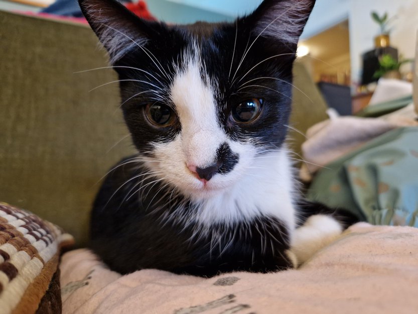 Sort med hvite sokker, hvit på magen som strekker seg rundt nakken og over nesa. Ca 4-5mnd og kontaktsøkende
