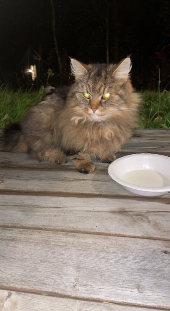 Katten har lusket rundt i nabolaget i flere måneder med har vært for redd til å komme bort til meg. Nå nylig kom den springende imot meg for å få masse kos, fikk litt melk utendørs. To dager senere bråker den voldsomt utenfor døra, jeg tok den inn og ga den mat.