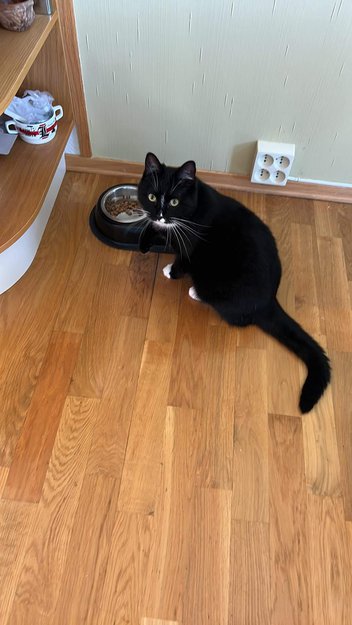 Svart liten hunnkatt på 1 år og 4 mnd. Lyder navnet Geggen og kom. Veldig gla i andre dyr og er kosete. Hiver seg ned på bakken for å få kos.
