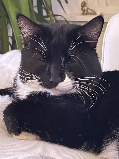 Katten har vandret i området. Heggesnaret, Engfaret og Seljeholtet. Den hadde blå sele på som var veldig stram så pelsen var slitt av. Noen tok den av. Lørdag observerte jeg katten og la ut på flere sider. I går fikk vi tatt han inn. Han er en utrolig snill pus. Han har spist godt. Brukt dokassen og klorestativet. Han er veldig sliten så han sover og sover. I natt var det kaldt. Så veldig glad vi fikk han inn. Han er ikke chippet og ukastrert,