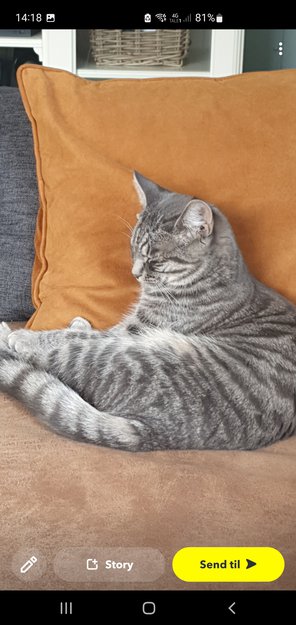 Hun har en "M" i pannen. Hun er sterilisert og chippet. Blanding av gråtoner i pelsen med masse striper. Hun er også en veldig liten hunnkatt størrelsemessig, selvom hun er ca. 1 år gammel.