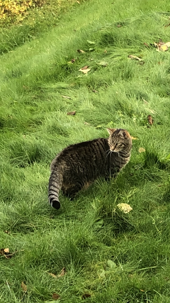 Stor katt, langhåret og har brun pels med svarte striper. Kan være snakkesalig