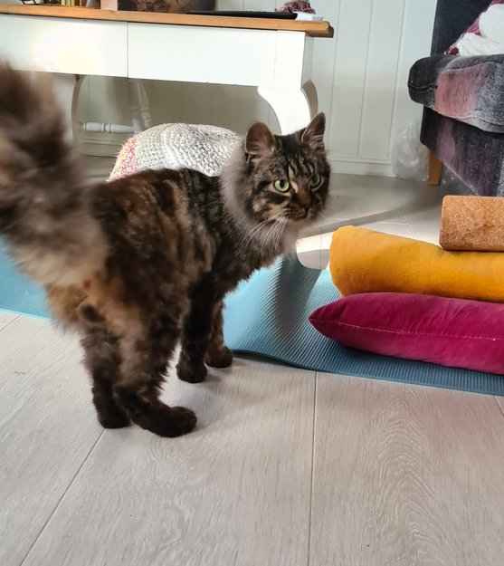 Veldig tam, men tynn hankatt vandret forvirret rundt i trafikken. Cirka 6-7 måneder, ikke chippet, ikke kastrert.