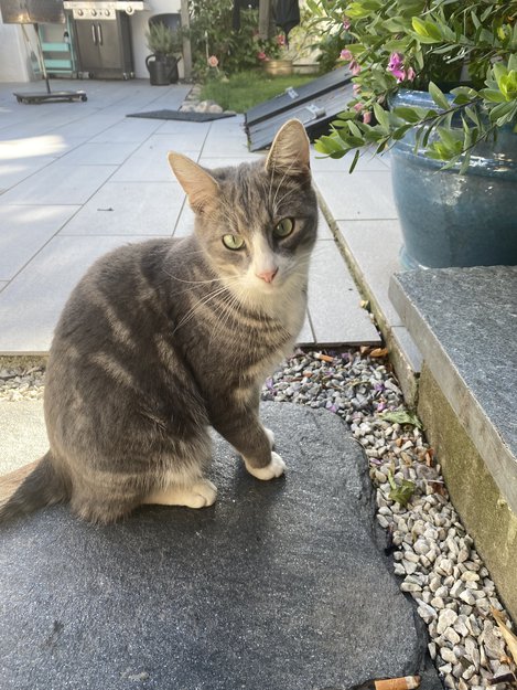 Har laget en tørr og lun hule til den under et halvtak i hagen og den får mat. Den trenger et hjem. Tror det er en ung hannkatt som et kastrert.