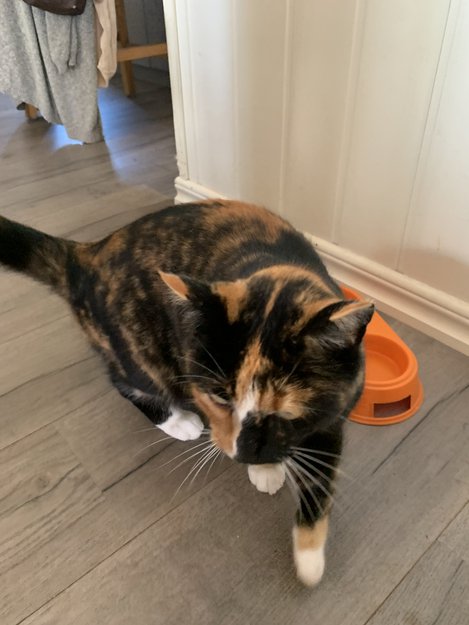 Jentepus, 6 år, sterilisert og chippet, liker kos, er nok stressa nå som hun har vært ute siden lørdag