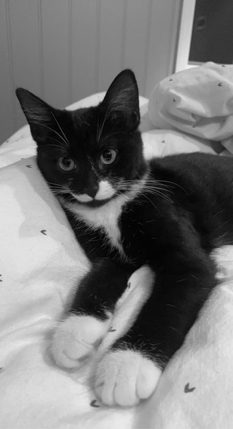 Svart kattunge med hvit bart, ben og hals! Tror det er en gutt men litt usikkert😅 katten et 6 månder gammel og en veldig kosen katt!