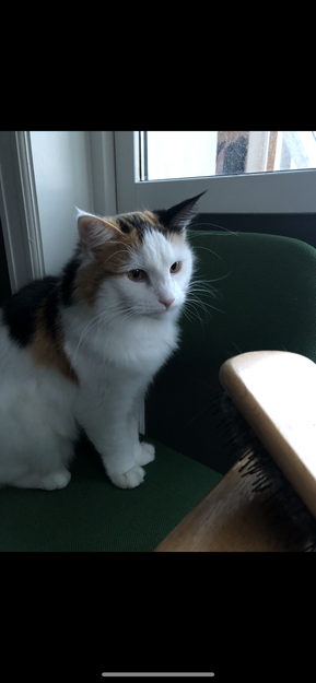 Sushi er hvit med brune og svarte flekker. Hun er veldig kosete.