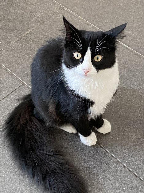 Hun er en veldig vennlig katt og liker å hilse til mennesker. Det er mulig at hun har gått i en kjeller eller garasje.