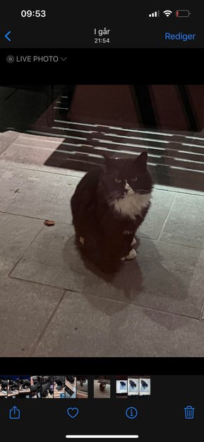 Svart og hvit katt ( trolig hankatt) går ute her. Naboer sier den er observert i 3- 4 år. Den bærer preg av å ha gått lenge ute. Finner ikke chip på katten. Katten har hvite labber.