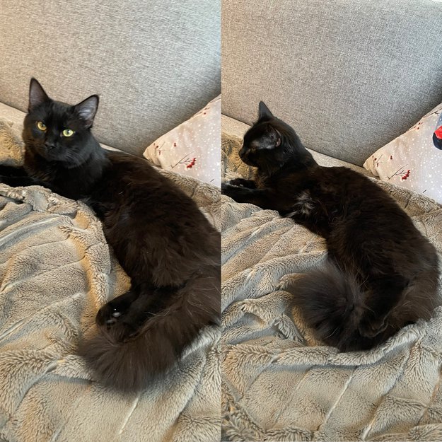 Han har svart pels med litt grått i pelsen. Han har lang og bustete hale og grønne øyne. Ble 1år i april.