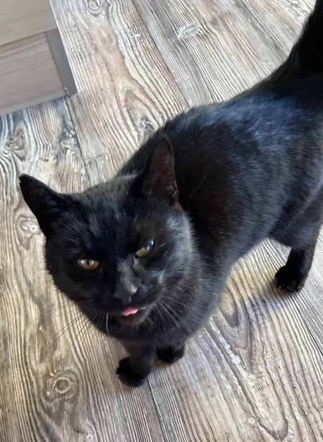 Brunsvart med enkelte hvite hår i pelsen. Har 1 hvitt værhår på høyre kinn. Kjælen og pratsom. Har ikke fått sjekket kjønn ordentlig men tror det er hunn (eller kastrert hann).
