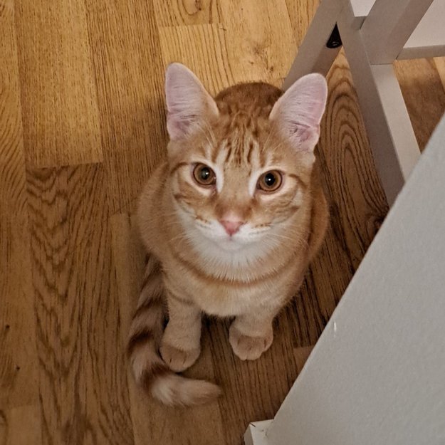 Kastrert hannkatt på ca 8 mnd. Er id-merket. Litt sky