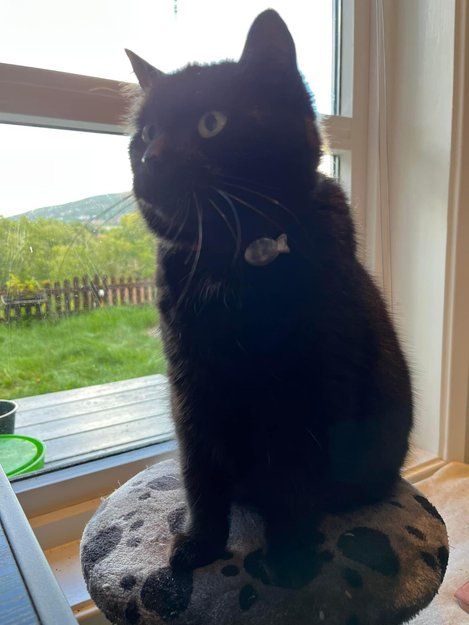 Frøken er litt tykk og veldig forsiktig. Hun har tykk, sort pels med en liten hvit flekk på brystet. Hun har et rød-rosa halsbånd med en refleks formet som en fisk.