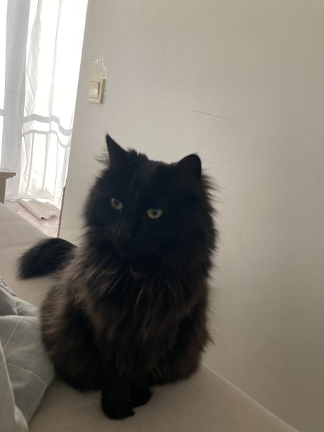 Hun er 3 år, kraftig, tung, veldig pen å se på, store gule øyne, fluffy pels, brun manke, mjauer sjeldent, sosial, men sky mot fremmede mennesker.